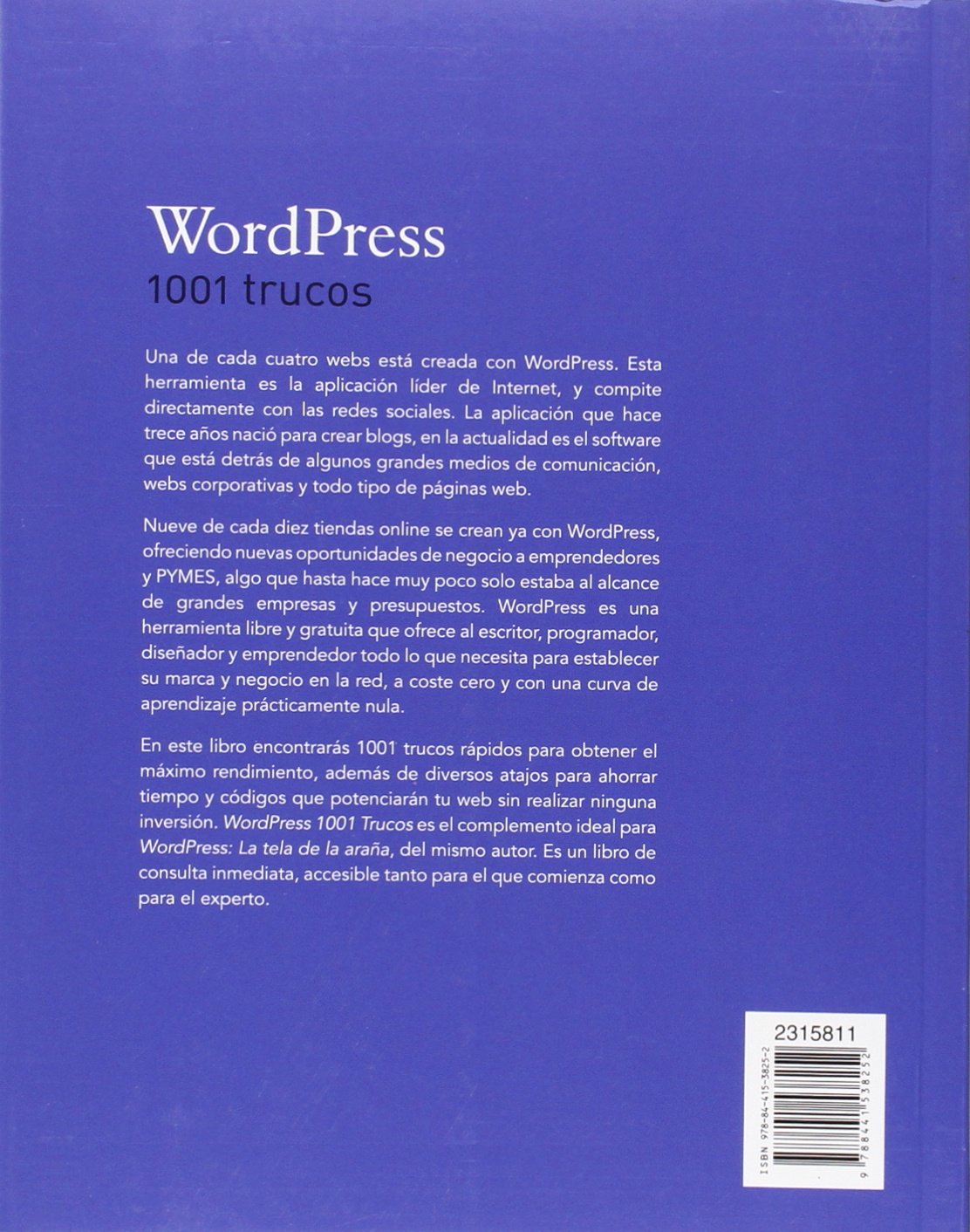 En este libro encontrarÔs mÔs de 1000 de los mejores trucos para WordPress que he recopilado y utilizado los últimos 10 años que llevo utilizando WordPress, muchos de ellos nunca publicados, enseñÔndolo a miles de alumnos y escribiendo sobre todo lo que esta fantÔstica aplicación ofrece al mundo web actualmente.